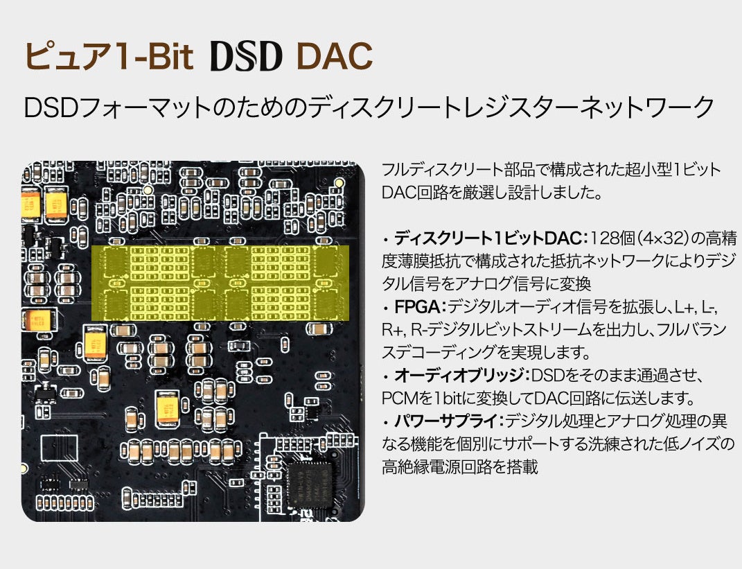 ・DAC:フルバランスディスクリート抵抗ネットワーク ピュア1-bit DSD DAC