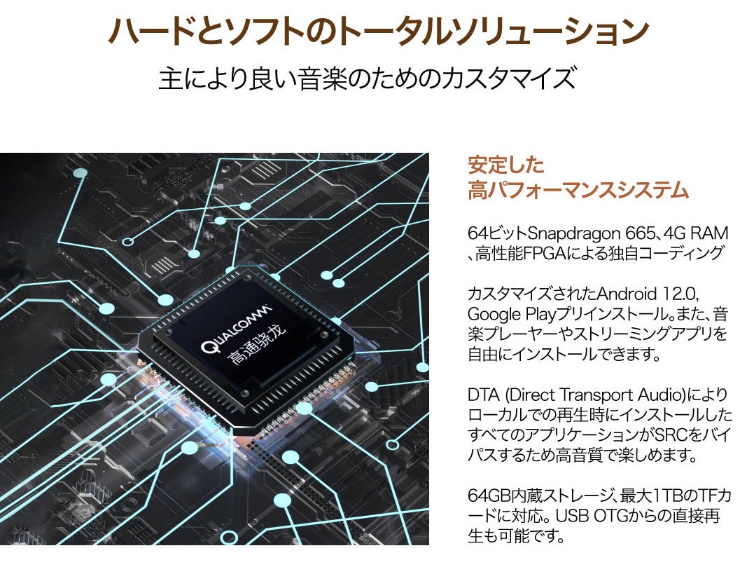 カスタマイズされたAndroid 12.0,Google Playプリインストール。また、音楽プレーヤーやストリーミングアプリを自由にインストールできます。DTA (Direct Transport Audio)によりローカルでの再生時にインストールしたすべてのアプリケーションがSRCをバイパスするため高音質で楽しめます。64GB内蔵ストレージ、最大1TBのTFカードに対応。USB OTGからの直接再生も可能です。