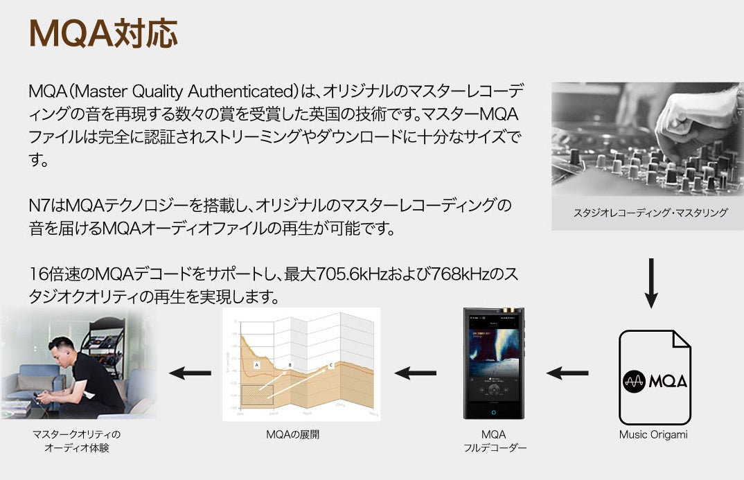 MQA(Master Quality Authenticated)は、オリジナルのマスターレコーディングの音を再現する数々の賞を受賞した英国の技術です。マスターMQAファイルは完全に認証されストリーミングやダウンロードに十分なサイズです。N7はMQAテクノロジーを搭載し、オリジナルのマスターレコーディングの音を届けるMQAオーディオファイルの再生が可能です。16倍速のMQAデコードをサポートし、最大705.6kl2および768kトのスタジオクオリティの再生を実現します。