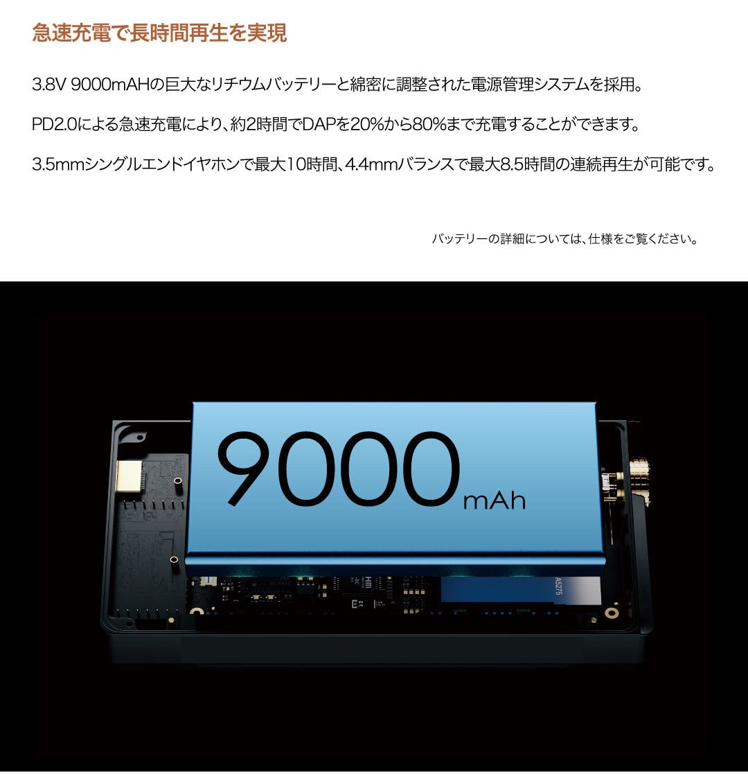 3.8V 9000mAHの巨大なリチウムバッテリーと綿密に調整された電源管理システムを採用。PD2.0による急速充電により、約2時間でDAPを20%から80%まで充電することができます。3.5mmシングルエンドイヤホンで最大10時間、4.4mmバランスで最大8.5時間の連続再生が可能です。