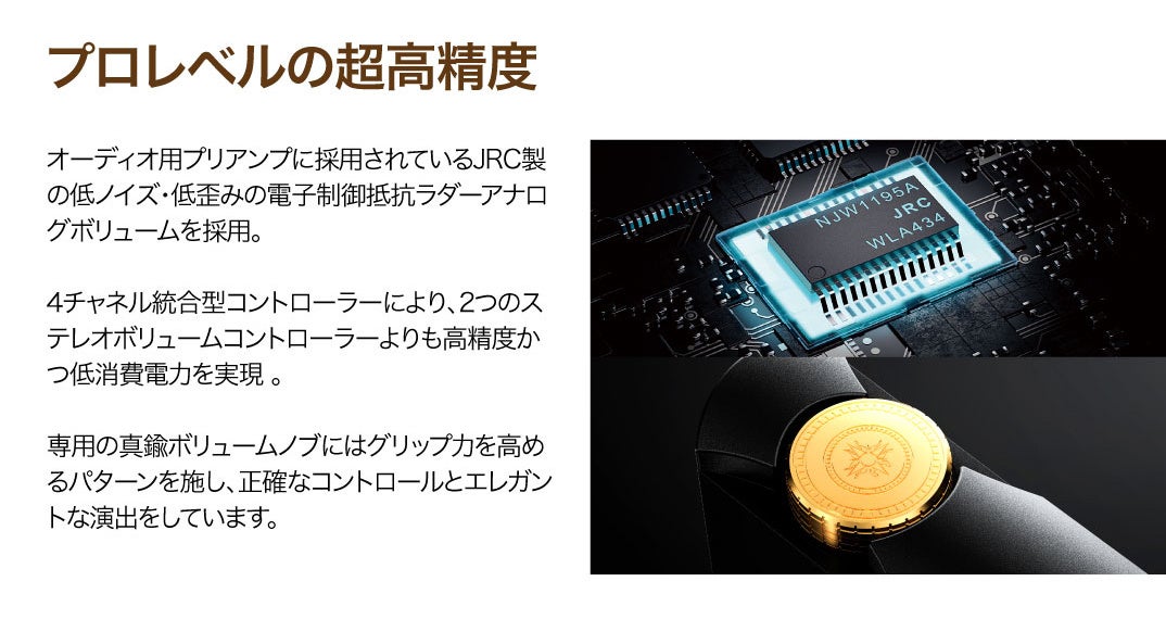 オーディオ用プリアンプに採用されているJRC製の低ノイズ・低歪みの電子制御抵抗ラダーアナログボリュームを採用。4チャネル統合型コントローラーにより、2つのステレオボリュームコントローラーよりも高精度かつ低消費電力を実現。専用の真鍮ボリュームノブにはグリップカを高めるパターンを施し、正確なコントロールとエレガントな演出をしています。