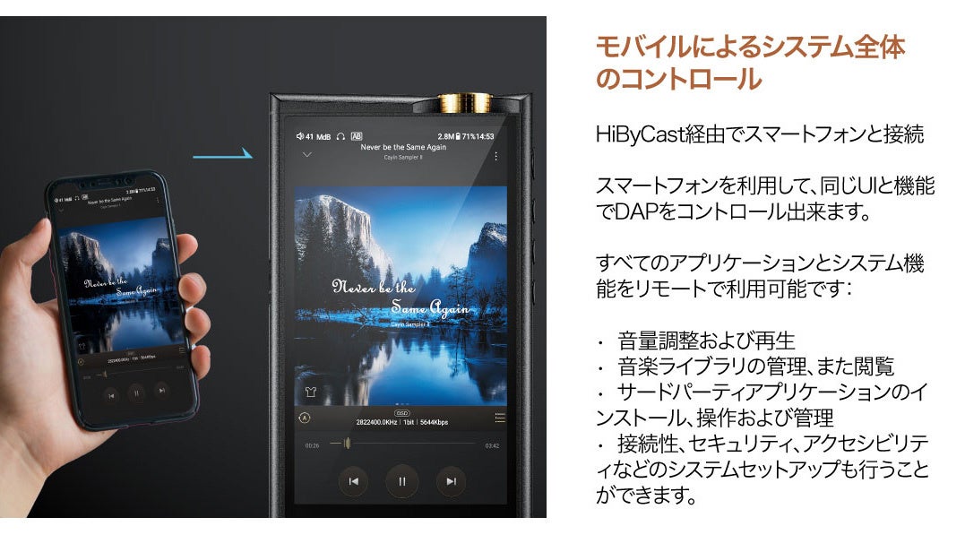 スマートフォンを利用して、同じUIと機能でDAPをコントロール出来ます。すべてのアプリケーションとシステム機能をリモートで利用可能です。