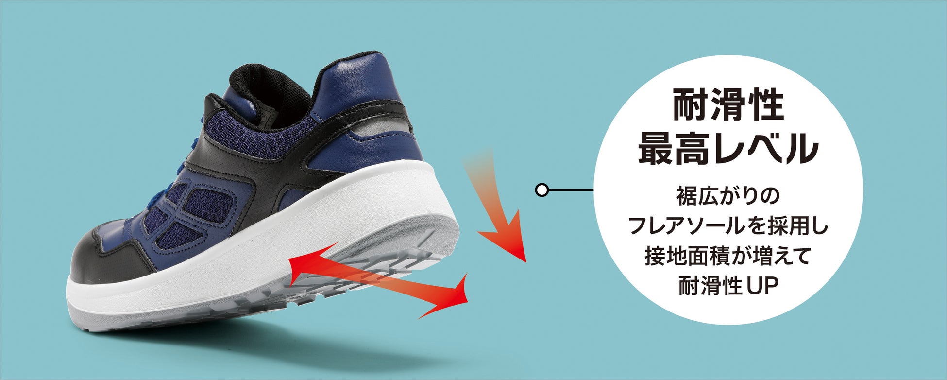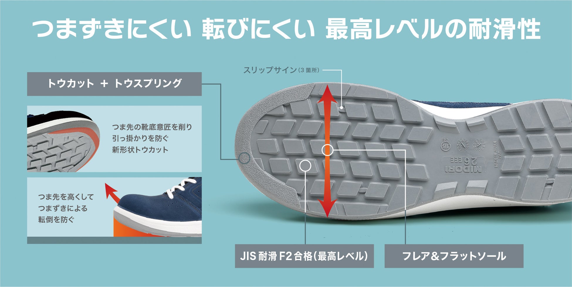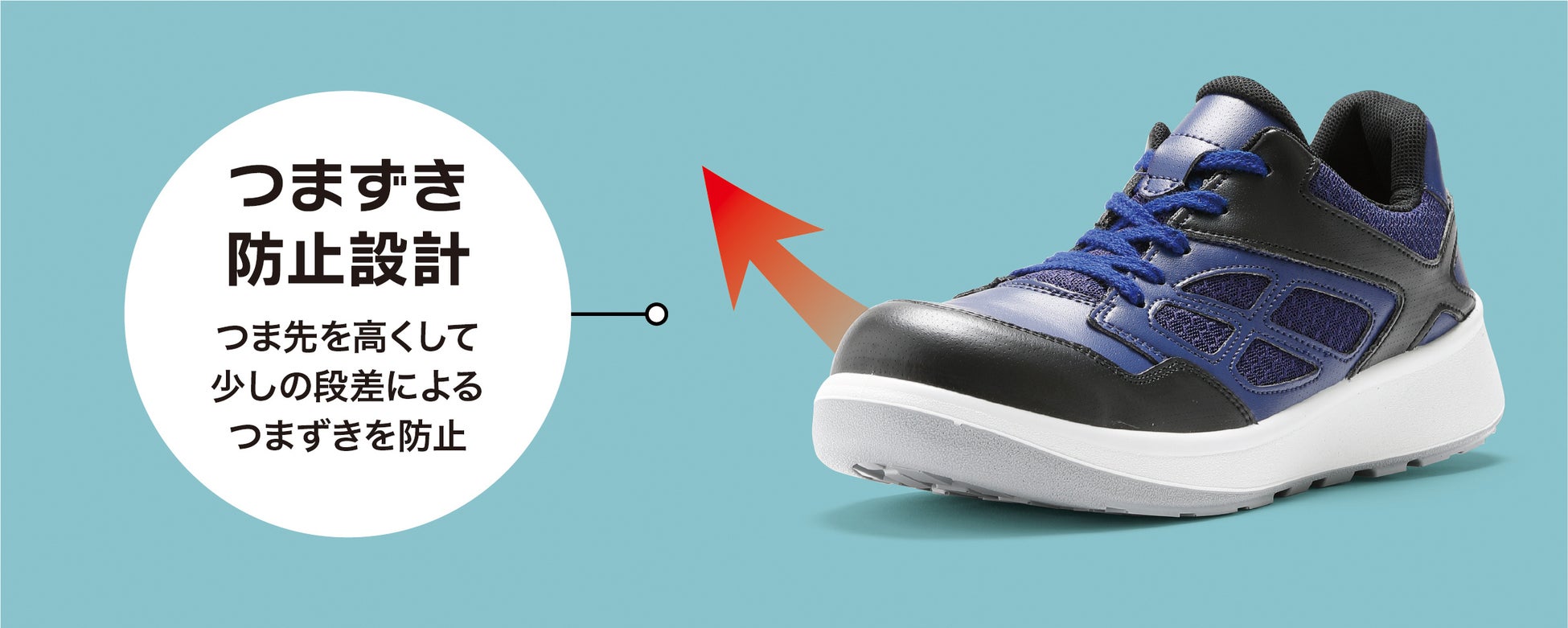 本製品の最大の特長は、つま先部分の上がりを高くした設計(高めのトウスプリング)と、つま先部分の形状の工夫(トウカット)を採用したつまずき防止設計です。これにより、つまずきのリスクを大幅に低減し、転倒事故の予防に貢献します。また、JIS規格で最高レベルの耐滑性能(JIS T8101 耐滑性試験のF2相当)も備えており、高いグリップ力で滑りやすい環境下でも安心して作業が行えます。