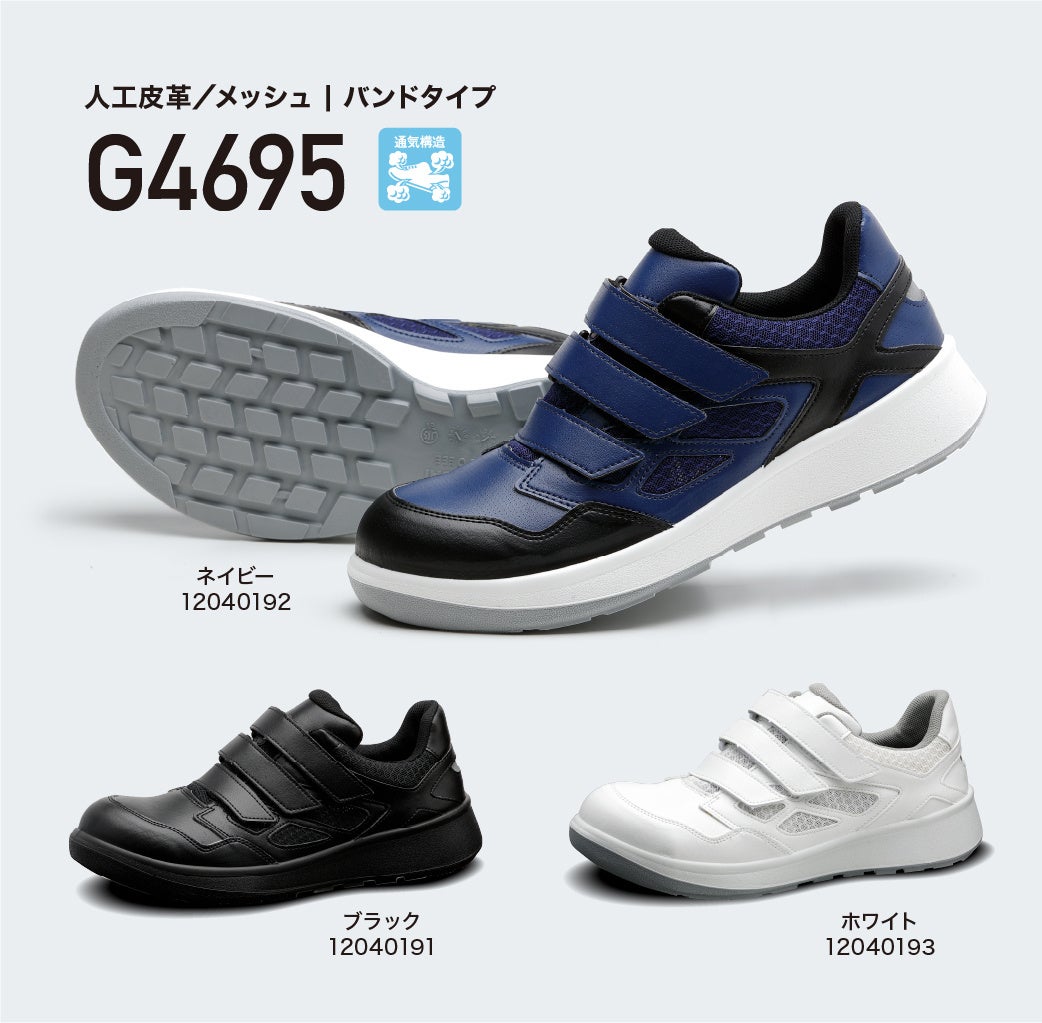 紐タイプのG4690(ネイビー/ブラック)と、バンドタイプのG4695(ネイビー/ブラック/ホワイト)の2種からお選びいただけます。また、それぞれ静電気対策を施した静電タイプ(G4690静電/G4695静電)もご用意しています。2024年11月には、ベロアタイプ・オール人工皮革タイプも発売予定です。