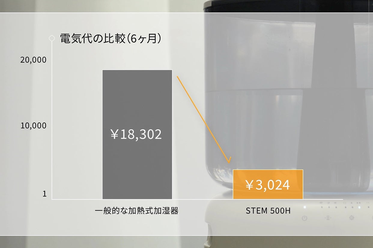 水を必要な分だけ加熱する超省エネ設計で、スチーム式加湿器と比較して6ヶ月の電気代を約1/6※3に抑えながら、雑菌の繁殖を抑制。清潔で安心なうるおいを届けます。
