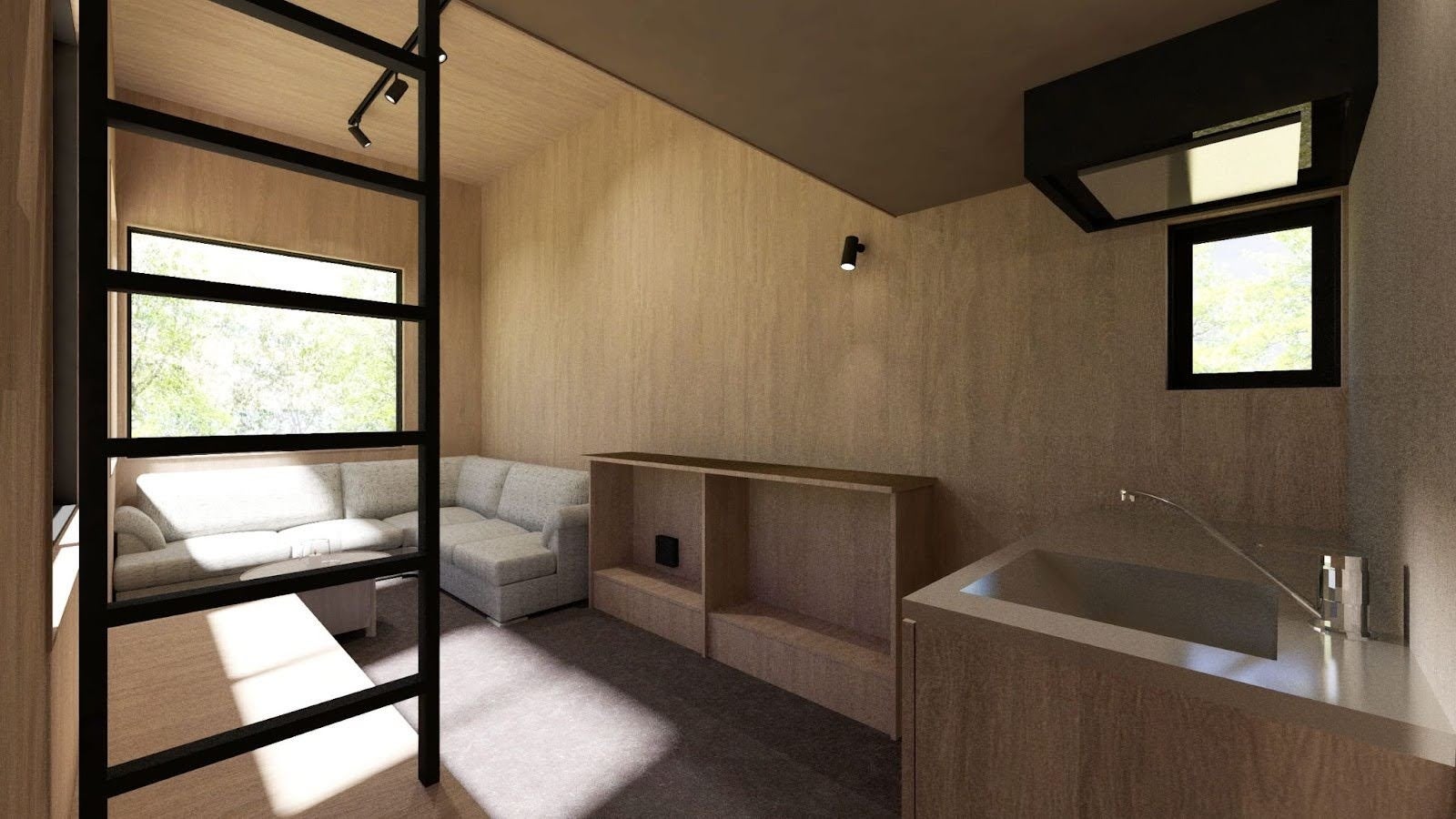 リビングエリアの天井高は約3mあり、タイニーハウスでありながら空間の広がりを感じていただけます。