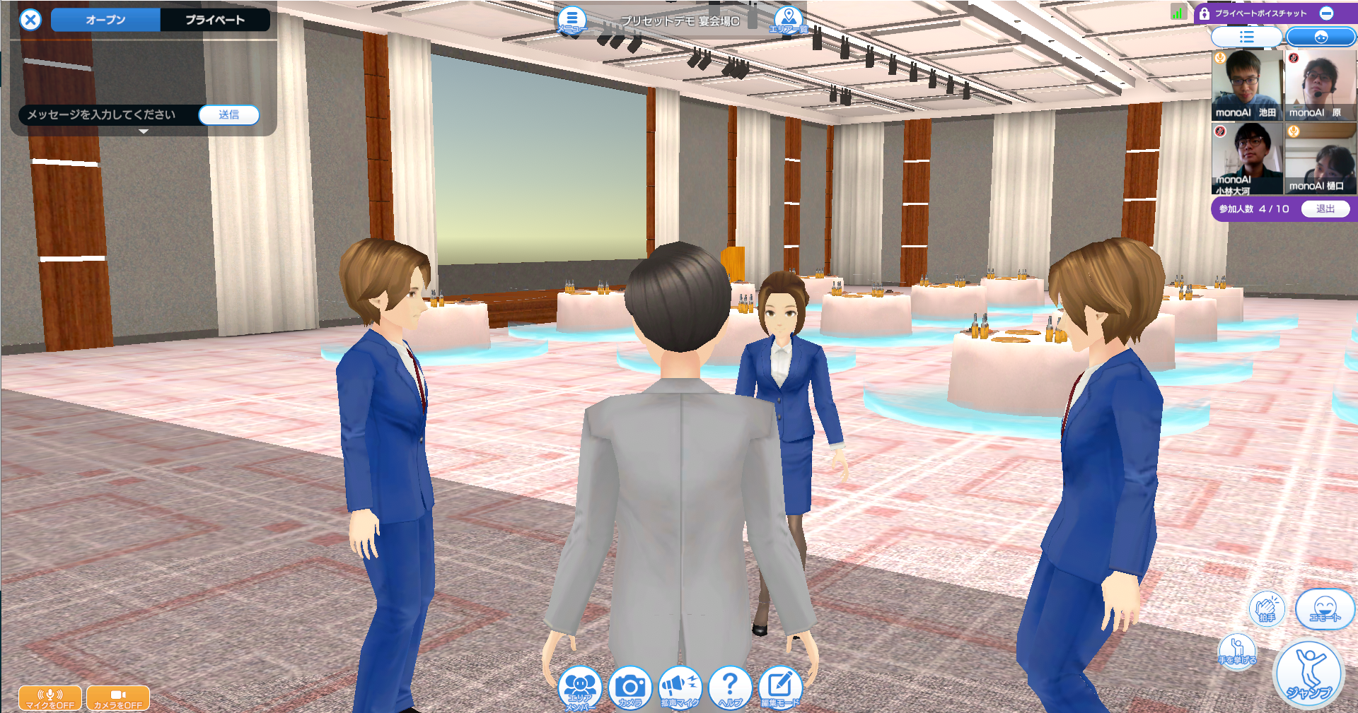 monoAI technology株式会社(本社:兵庫県神戸市、代表取締役社長:本城嘉太郎、モノアイテクノロジー、以下monoAI)は、株式会社HITOSUKE(本社:東京都中央区、代表取締役:小比田 隆太、以下HITOSUKE)が主催するイベント『家工房 全国大会』、『金沢屋 全国大会』にメタバース・プラットフォーム「XR CLOUD(エックスアールクラウド)」を提供いたしましたことをお知らせいたします。本イベントは「家工房」「金沢屋」の1年間の振返りと、フランチャイズ全加盟店が共通の価値観と方向性を持ち、チェーン全体のブランド力を強化していくことを目的に毎年開催しているイベントです。本年は新型コロナウイルスの感染拡大を防ぐため、メタバース空間での開催を実施、代表取締役 CEO小比田 隆太によるスピーチ、執行役員による年度の振り返り、加盟店オーナーの表彰者の発表などの催しを自宅に居ながら全国の加盟店との交流を楽しんでいただきました。