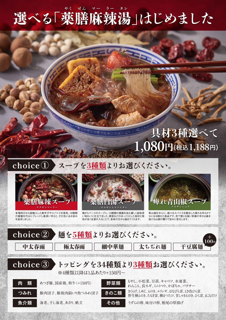 麻辣湯と薬膳火鍋の店『担担辛辛』に「スープ」も「麺」も「具材」も選べる麻辣湯が新発売!!