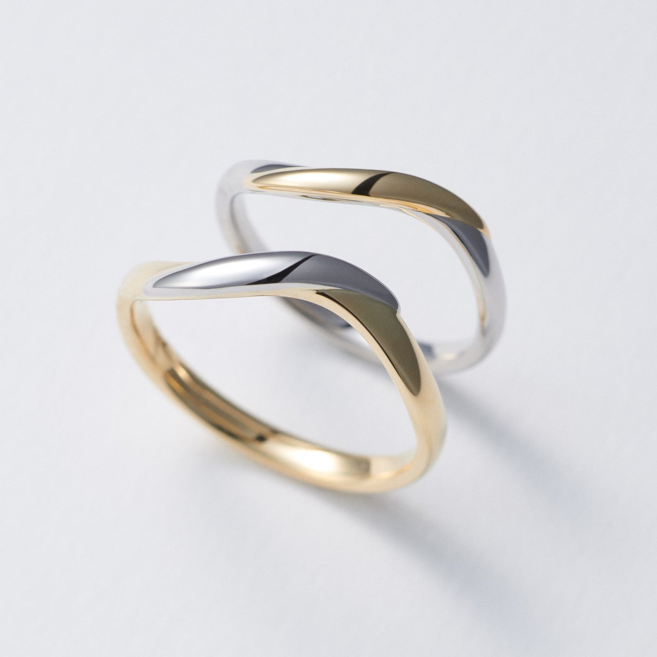 身に着けたときに指を美しく長く見せるよう、S字の角度やなめらかさにこだわり制作した結婚指輪。しなやかで大胆な曲線と、2色の地金の切り替え部分のシームレスな仕上がりが魅力のデザインです。