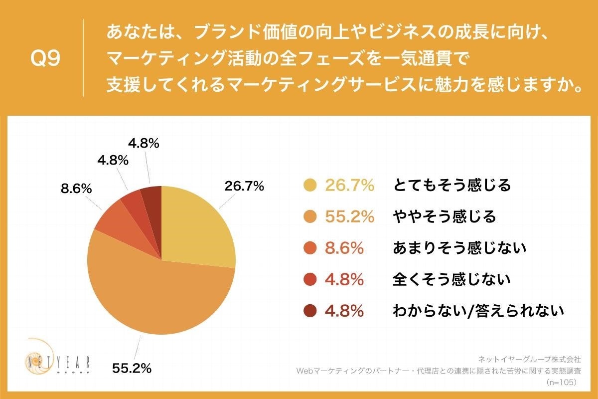 「Q9.あなたは、ブランド価値の向上やビジネスの成長に向け、マーケティング活動の全フェーズを一気通貫で支援してくれるマーケティングサービスに魅力を感じますか。」(n=105)と質問したところ、「とてもそう感じる」が26.7%、「ややそう感じる」が55.2%という回答となりました。