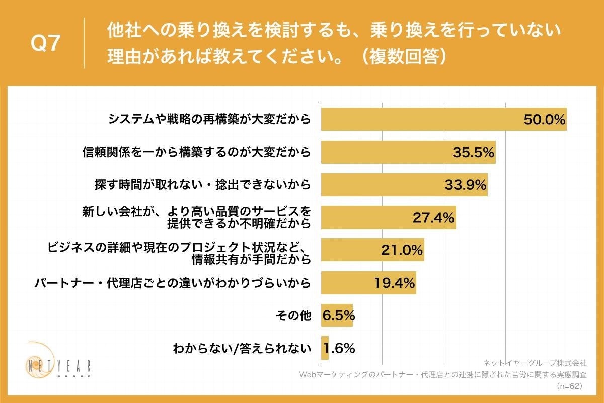 Q6で「とても検討している」「やや検討している」と回答した方に、「Q7.他社への乗り換えを検討するも、乗り換えを行っていない理由があれば教えてください。(複数回答)」(n=62)と質問したところ、「システムや戦略の再構築が大変だから」が50.0%、「信頼関係を一から構築するのが大変だから」が35.5%、「探す時間が取れない・捻出できないから」が33.9%という回答となりました。