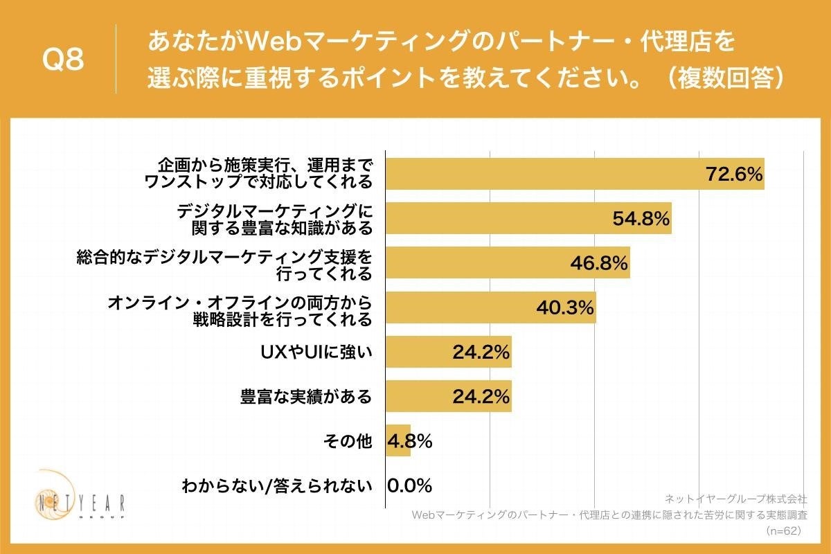Q6で「とても検討している」「やや検討している」と回答した方に、「Q8.あなたがWebマーケティングのパートナー・代理店を選ぶ際に重視するポイントを教えてください。(複数回答)※デジタルマーケティングとは、様々なデジタルチャネル・マーケティングデータ・テクノロジーを活用し、あらゆるステージの顧客に対してマーケティング活動を行うことを指し、その中にWebマーケティングも包含されます。」(n=62)と質問したところ、「企画から施策実行、運用までワンストップで対応してくれる」が72.6%、「デジタルマーケティングに関する豊富な知識がある」が54.8%、「総合的なデジタルマーケティング支援を行ってくれる」が46.8%という回答となりました。