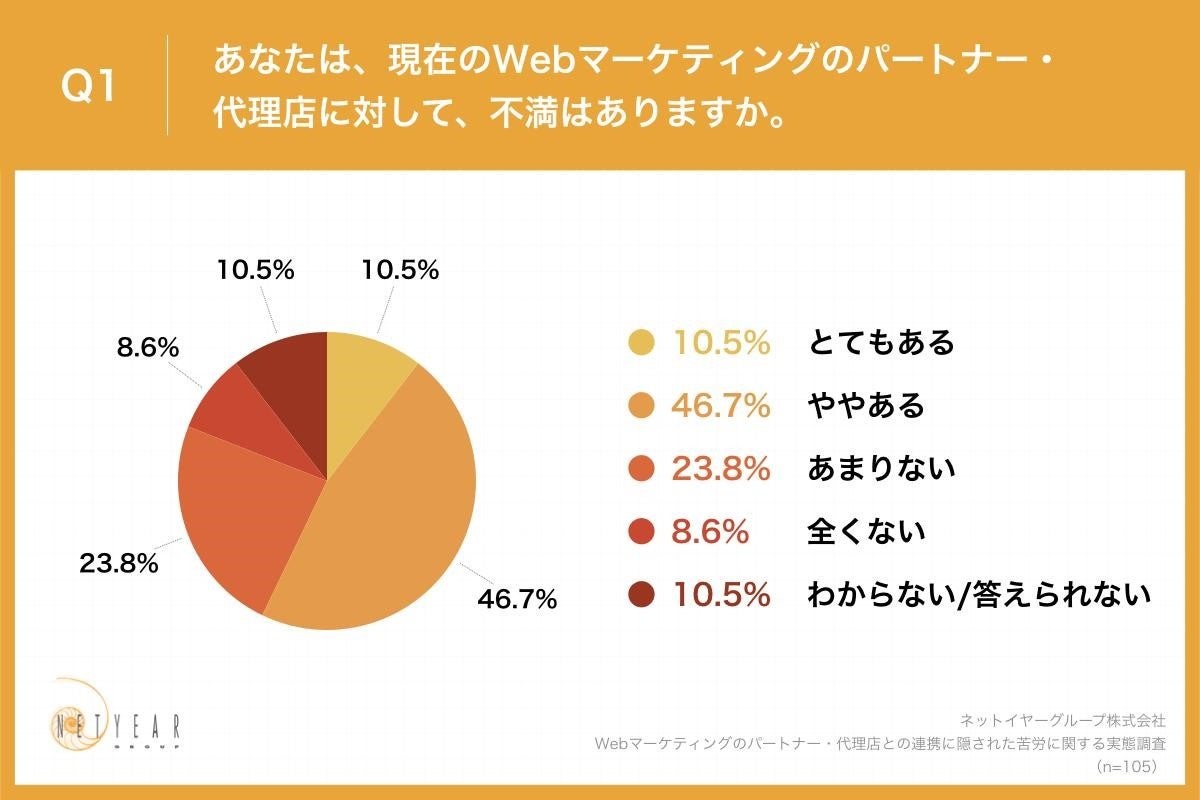 「Q1.あなたは、現在のWebマーケティングのパートナー・代理店に対して、不満はありますか。」(n=105)と質問したところ、「とてもある」が10.5%、「ややある」が46.7%という回答となりました。