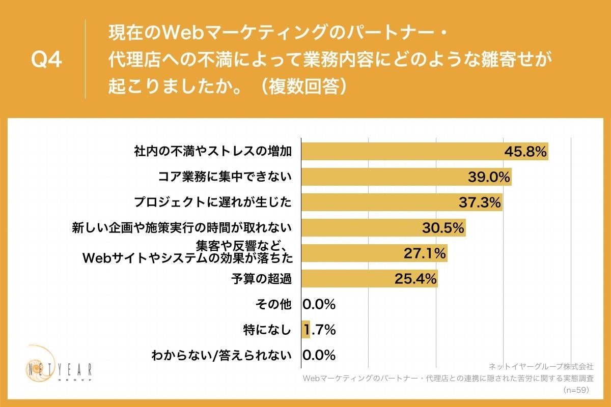 Q2で「わからない/答えられない」以外を回答した方に、「Q4.現在のWebマーケティングのパートナー・代理店への不満によって業務内容にどのような雛寄せが起こりましたか。(複数回答)」(n=59)と質問したところ、「社内の不満やストレスの増加」が45.8%、「コア業務に集中できない」が39.0%、「プロジェクトに遅れが生じた」が37.3%という回答となりました。