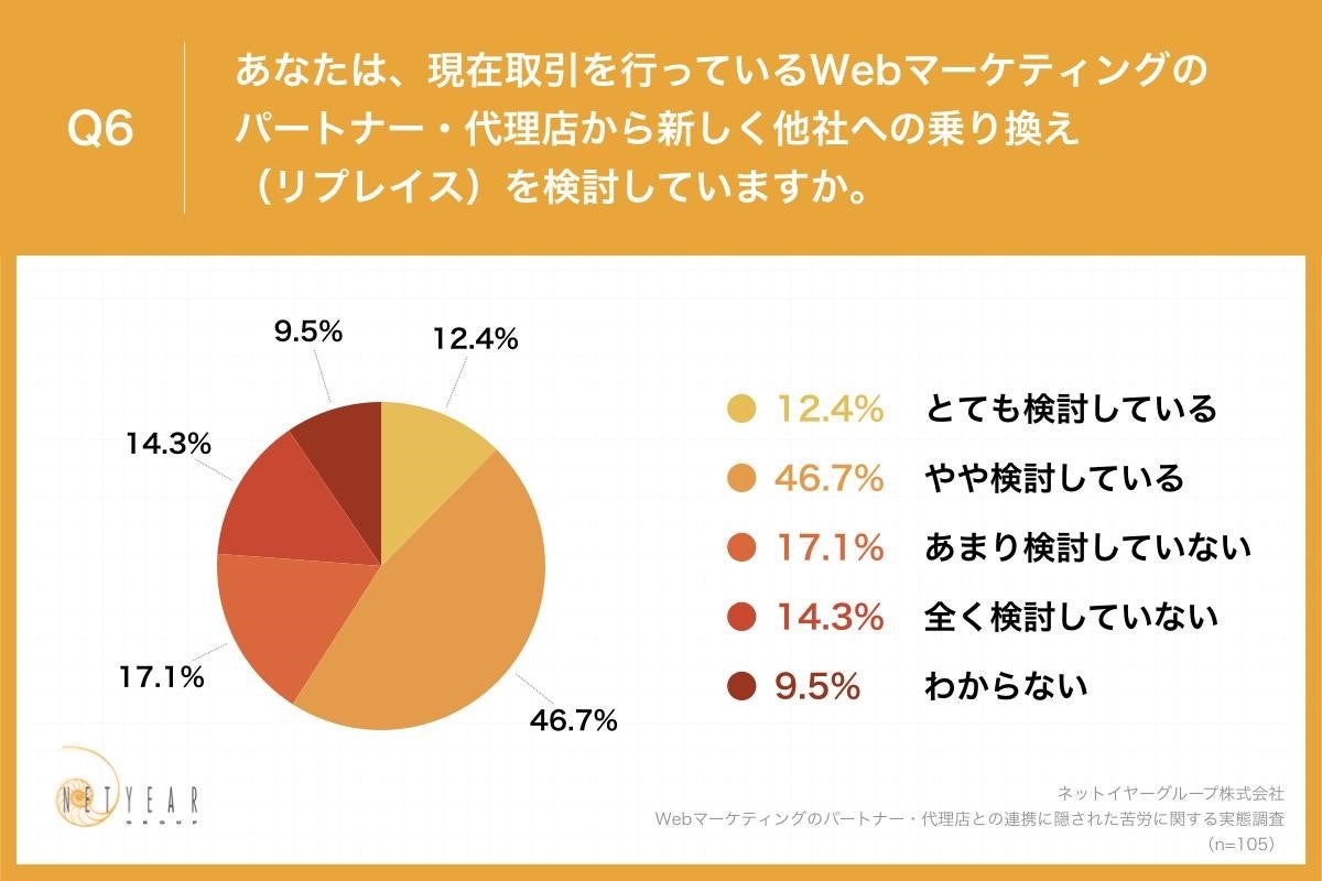 「Q6.あなたは、現在取引を行っているWebマーケティングのパートナー・代理店から新しく他社への乗り換え(リプレイス)を検討していますか。」(n=105)と質問したところ、「とても検討している」が12.4%、「やや検討している」が46.7%という回答となりました。