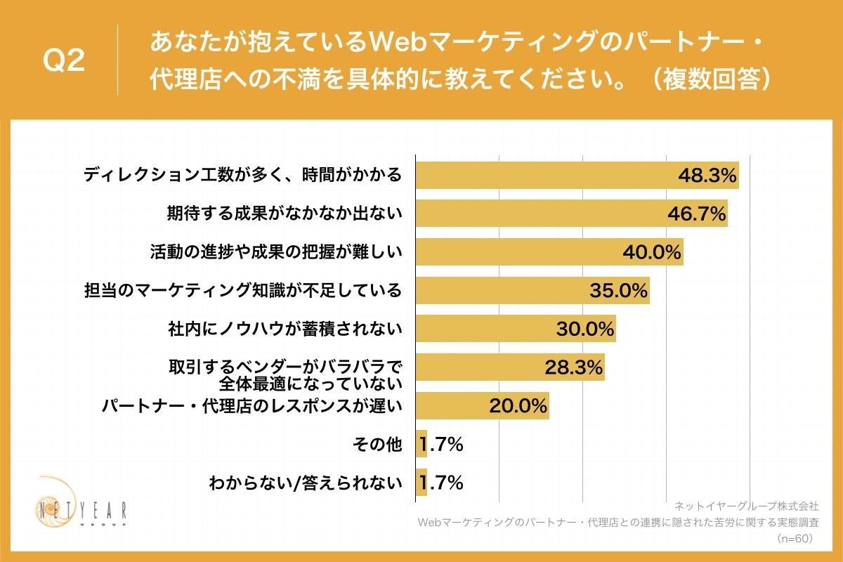 Q1で「とてもある」「ややある」と回答した方に、「Q2.あなたが抱えているWebマーケティングのパートナー・代理店への不満を具体的に教えてください。(複数回答)」(n=60)と質問したところ、「ディレクション工数が多く、時間がかかる」が48.3%、「期待する成果がなかなか出ない」が46.7%、「活動の進捗や成果の把握が難しい」が40.0%という回答となりました。