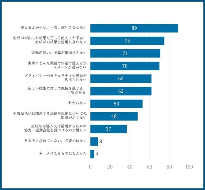 導入ネックとして最も多かった回答は「使えるかが不明、不安、使いこなせない」と「生成AIが出した結果を正しく使えるか不安、生成AIの結果を信用しきれない」という2つであった。