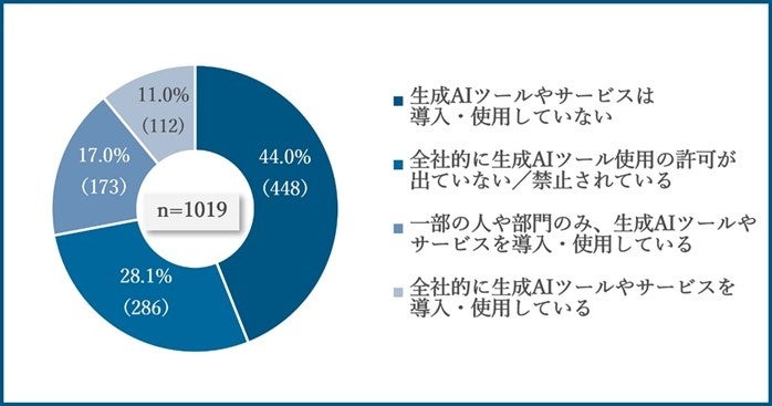 生成AIの導入状況(左図)に関しては、「生成AIツールやサービスを導入・使用していない」企業が44.0%を占める結果となった。次いで「全社的に使用が許可されていない、あるいは禁止されている」企業も28.1%に上ることが分かった 。一方、「一部の人や部門での導入」は17.0%であり、「全社的に生成AIを導入している」企業は11.0%に留まった。