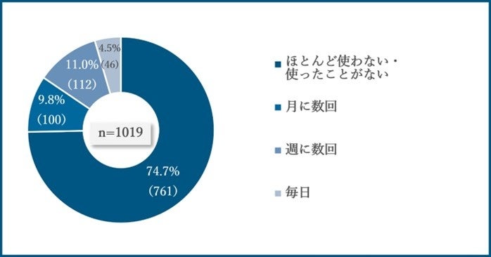 個人の業務での生成AIの使用頻度(上図)に関しては、「ほとんど使わない・使ったことがない」と回答した割合が74.7%と圧倒的に高く、「月に数回」は9.8%、「週に数回」は11.0%であり、「毎日」使用しているという回答はわずか4.5%に留まった。