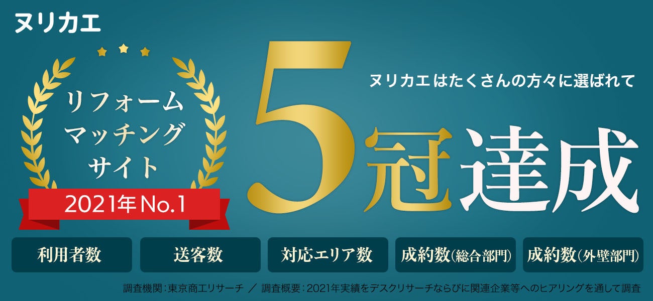 外壁塗装の会社探しサイト「ヌリカエ」は、「リフォームマッチングサイトに関するランキング調査」にて、利用者数・送客数・対応エリア数・成約数(総合部門)・成約数(外壁部門)で全て1位を獲得