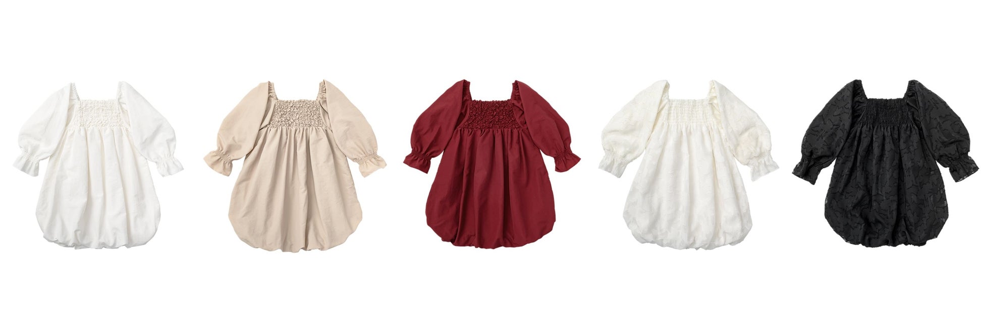袖も裾もバルーンで表現した、子どもらしい「丸み」を引き出すシルエット。バスト部分をシャーリングで仕上げたことにより、どんな月齢でも可愛く着こなせます。