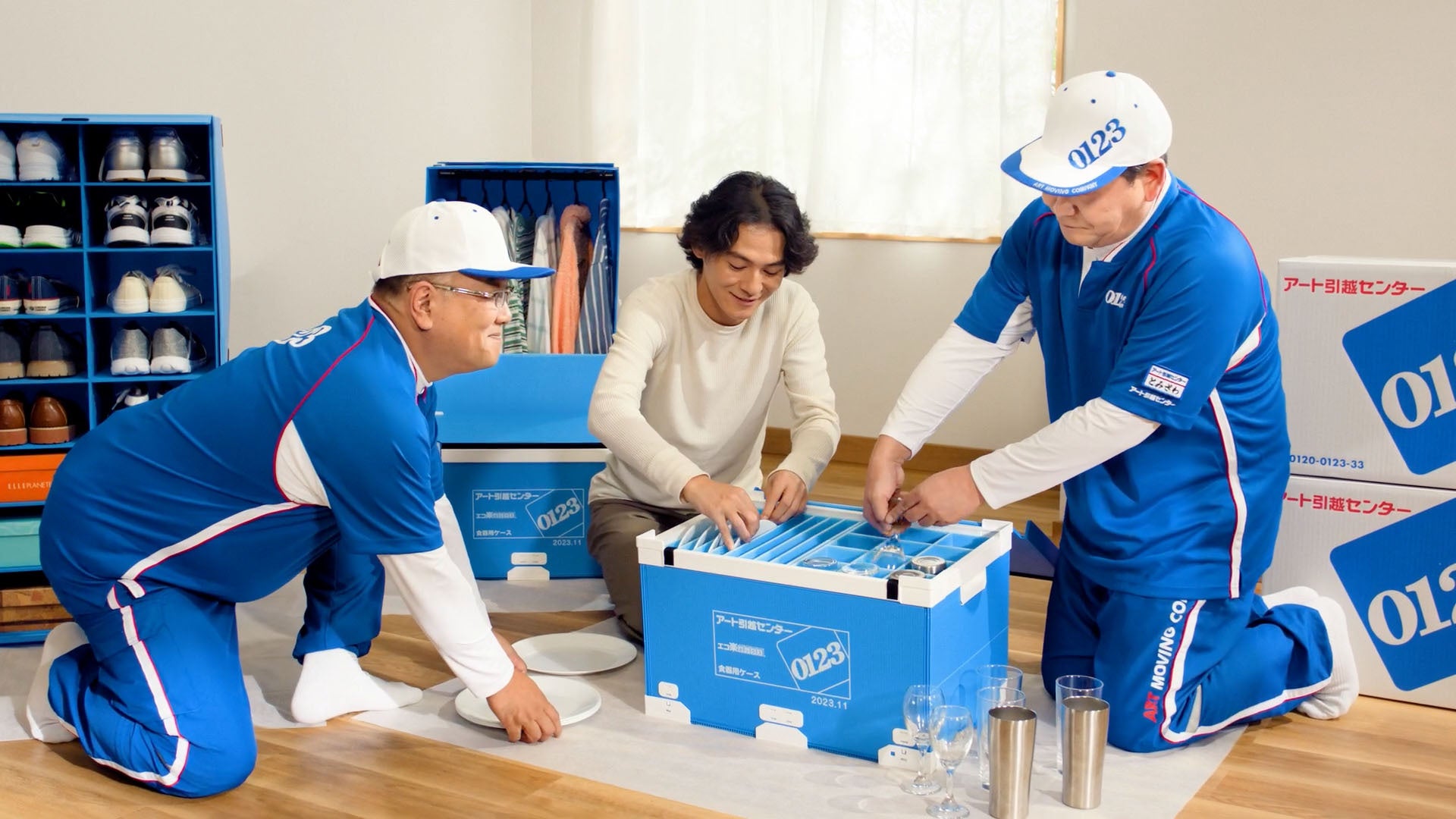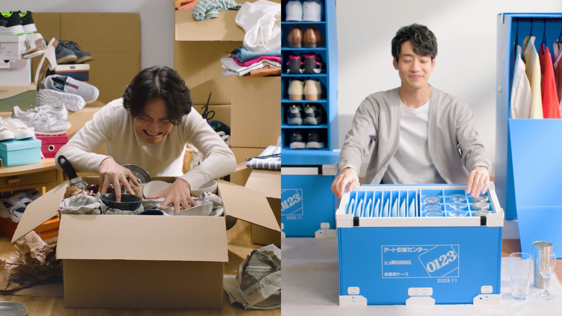 荷造りがうまく進まない引越作業に、困り果てた表情の男性。そこに当社のムービングスタッフに扮したサンドウィッチマンのお二人がエコ楽ボックスを渡します。引越で特に大変な食器の荷造りや荷解きもエコ楽ボックスを使えば、手間や負担が軽減されて楽に引越ができます。荷造りが捗り男性の表情も晴れやかに。