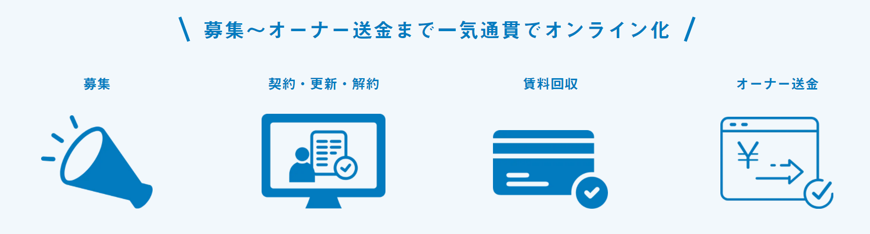 業務量の割に賃料が低く、費⽤対効果が合わない駐⾞場管理を、募集から契約・賃料回収・オーナー送金まで全てオンラインで完結できるので業務負荷が軽減でき費⽤対効果が向上します。