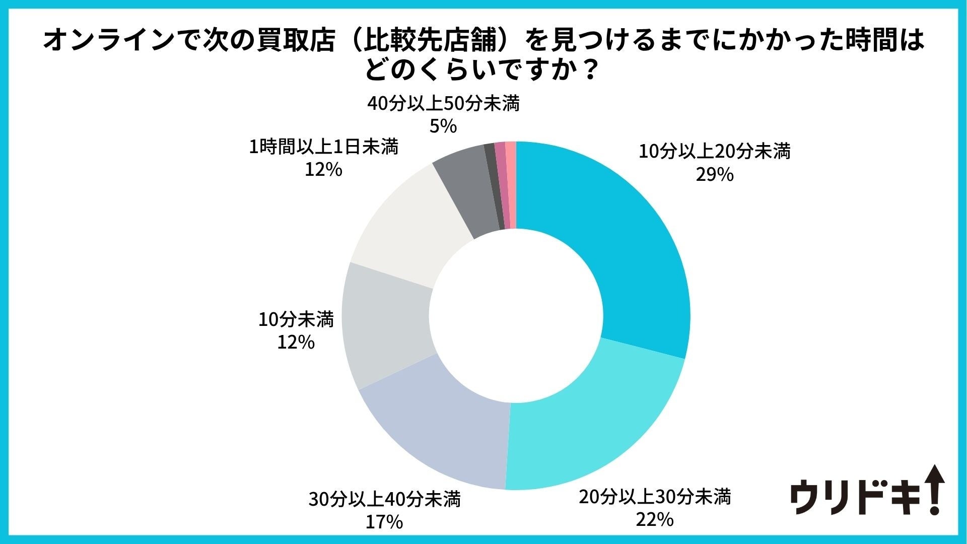 また、オンライン査定で次の買取店を見つけるまでにかかった時間は「10分以上20分未満」が最多であり、比較検討にかかる時間が比較的短い傾向にあります。