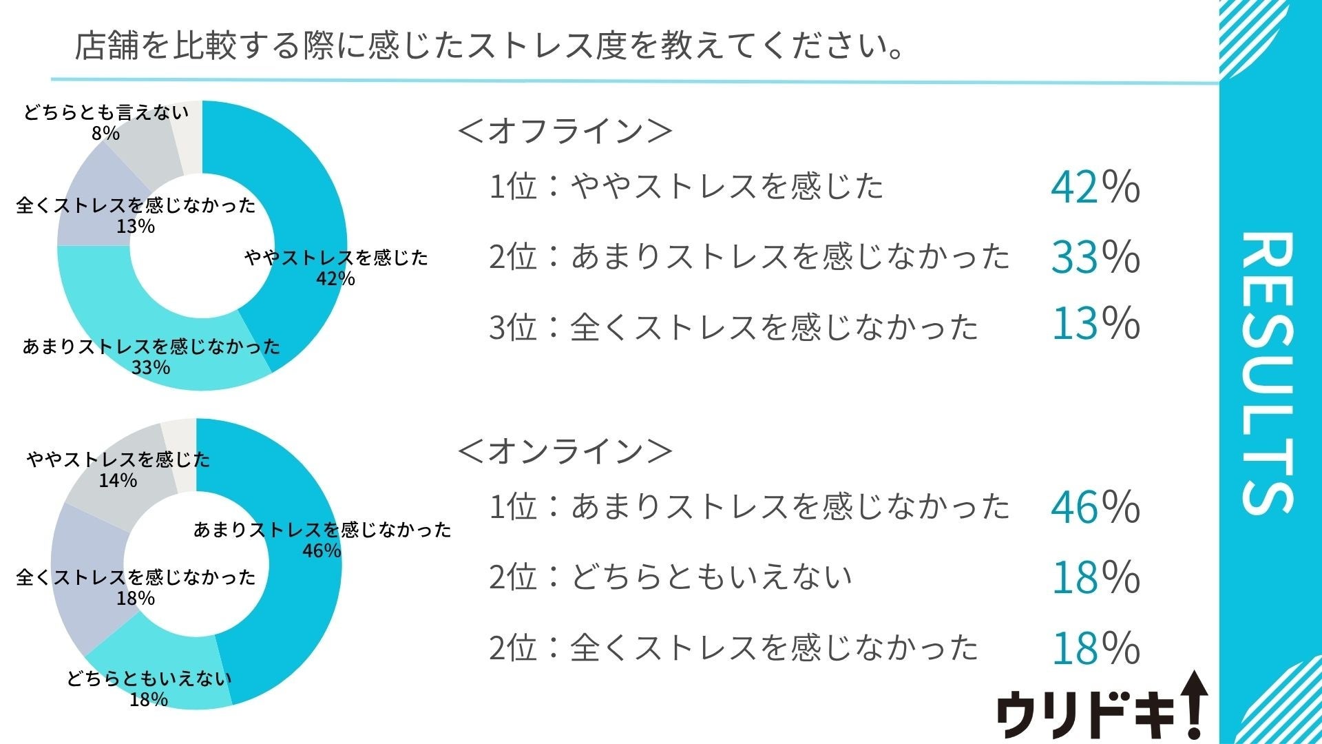 オフラインでは「ややストレスを感じた」が最多、オンラインでは「あまりストレスを感じなかった」が最多と、ユーザー体験の質にも差が見られます。