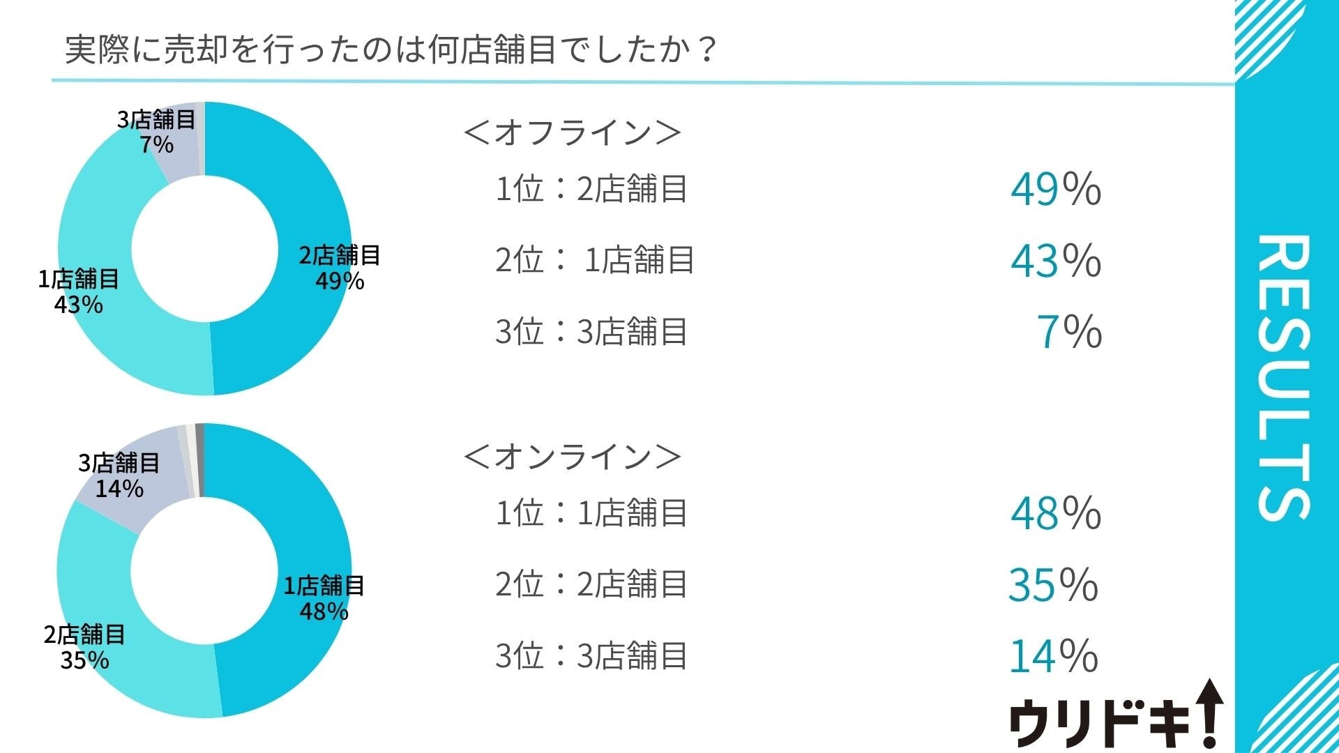 査定依頼から買取店を決定するまでの所要時間は、オンライン・オフラインともに「1時間以上1日未満」が最多となりました。しかしその内訳を見ると、オンライン査定では1店舗目で売却を決める傾向が強く、比較行動を行わずに即決するケースが多いことが分かります。