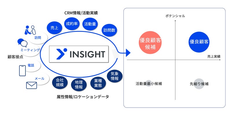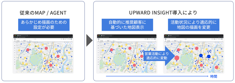 「UPWARD INSIGHT」は新たにAI/機械学習を活用して、本当に「行くべき先」である、売上実績が高くないが成約見込み(ポテンシャル)が高い優良顧客候補を抽出します。これにより、営業担当が本当に「行くべき先」への戦略的な訪問活動をアプローチするサポートを行います。