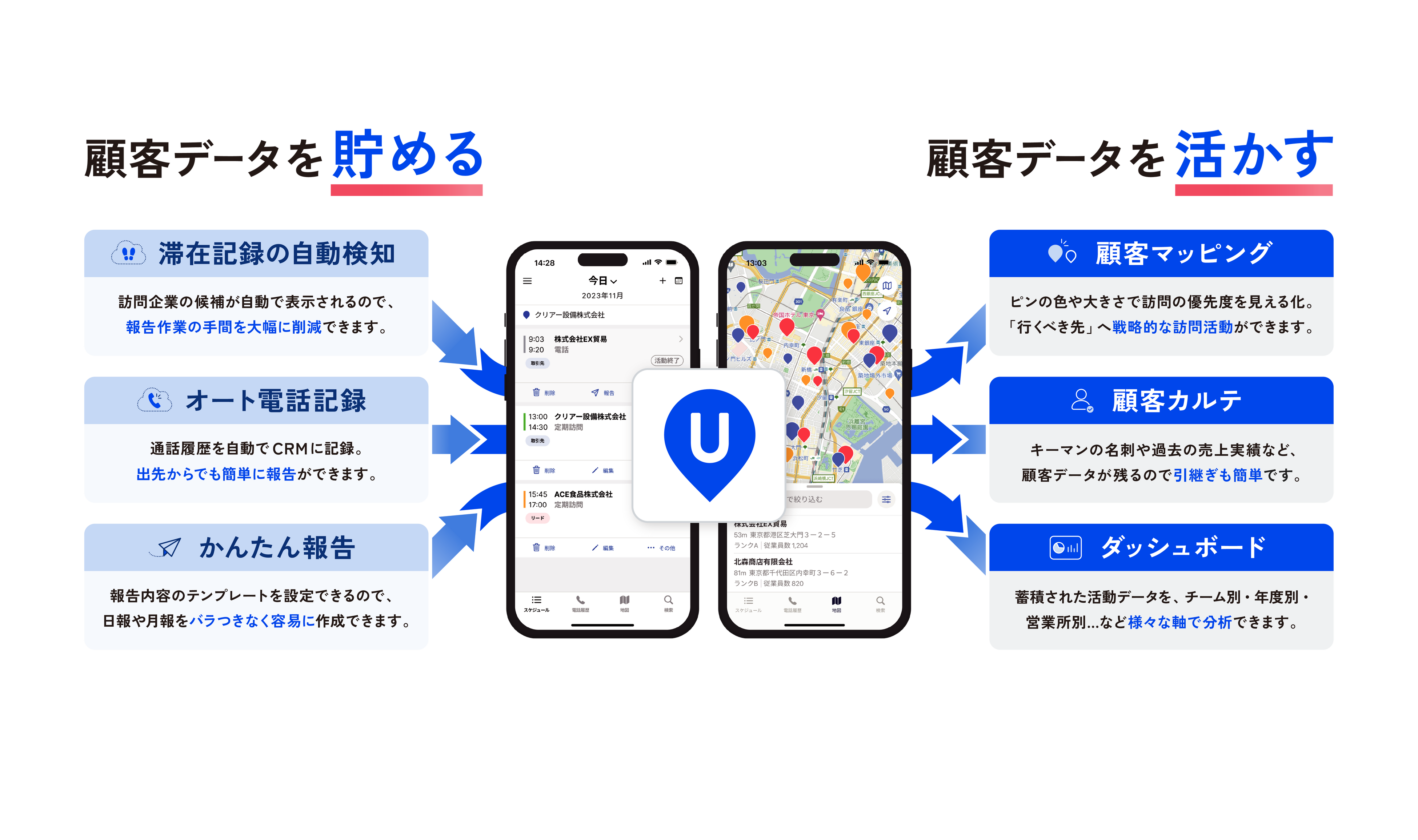 UPWARDはCRM・SFAの価値を最大化する「セールスエンゲージメント」を実現するアプリです。顧客データを“貯める・活かす”ことを軸に、SalesforceやMicrosoft Dynamics365といったクラウドCRMと連携し、外回り・訪問営業の方々がより創造的に働けるよう、多様なサポート機能を提供します。