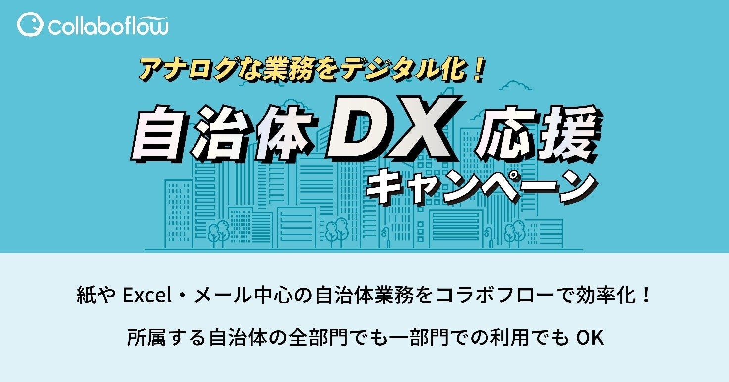 そこで、庁内業務のデジタル化・業務のスマート化を進めたいと考える官公省庁や地方自治体などに対象に、ワークフローサービス「コラボフロー」を最大1年間無料で利用していただける「自治体DX応援キャンペーン」を2024年5月1日より、2025年5月31日まで実施します。