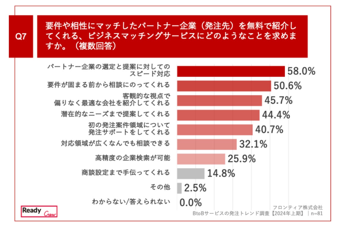 Q6で「とてもある」「ややある」と回答した方に、「Q7.要件や相性にマッチしたパートナー企業(発注先)を無料で紹介してくれる、ビジネスマッチングサービスにどのようなことを求めますか。(複数回答)」(n=81)と質問したところ、「パートナー企業の選定と提案に対してのスピード対応」が58.0%、「要件が固まる前から相談にのってくれる」が50.6%、「客観的な視点で偏りなく最適な会社を紹介してくれる」が45.7%という回答となりました。
