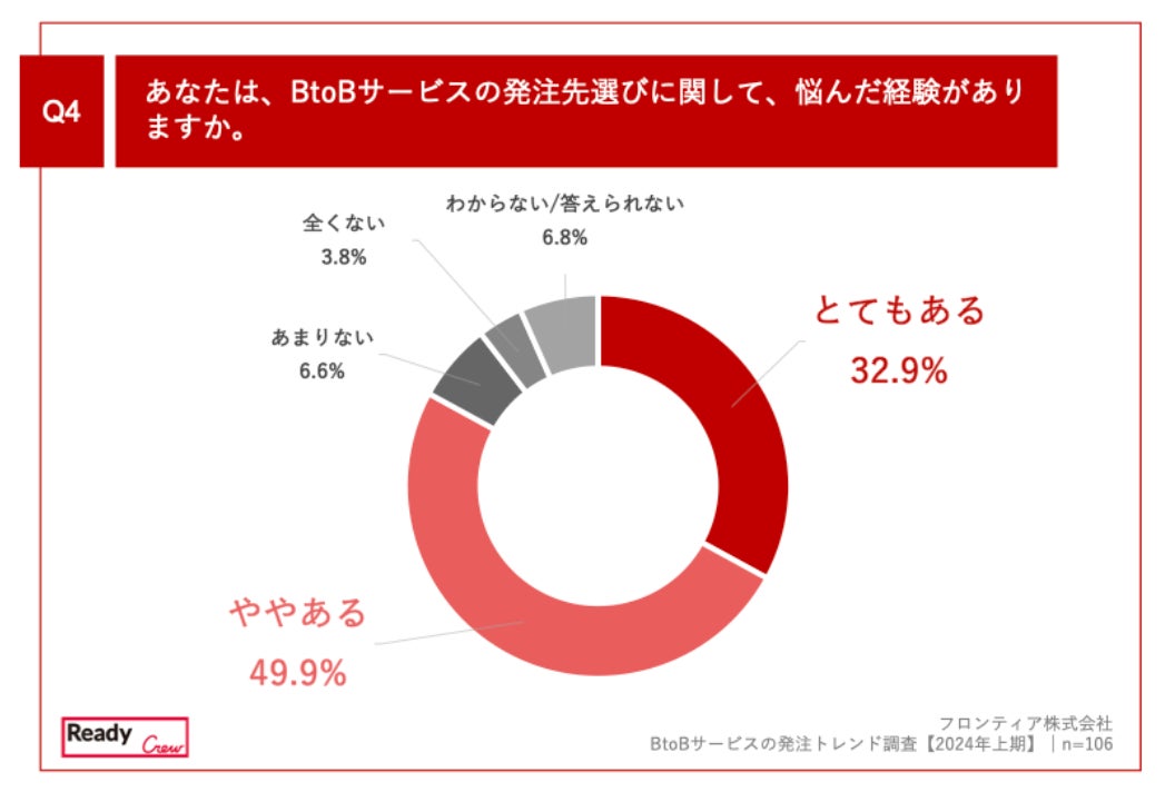 「Q4.あなたは、BtoBサービスの発注先選びに関して、悩んだ経験がありますか。」(n=106)と質問したところ、「ややある」が49.9%、「とてもある」が33.0%という回答となりました。
