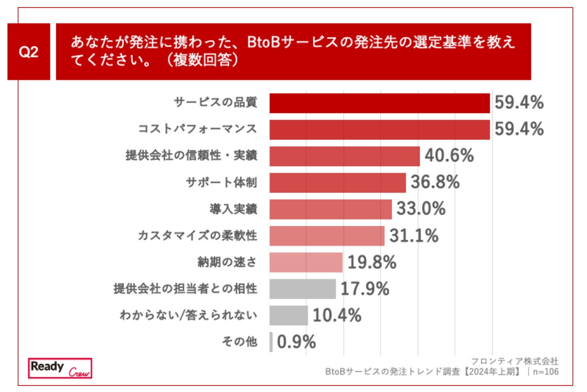 「Q2.あなたが発注に携わった、BtoBサービスの発注先の選定基準を教えてください。(複数回答)」(n=106)と質問したところ、「サービスの品質」が59.4%、「コストパフォーマンス」が59.4%、「提供会社の信頼性・実績」が40.6%という回答となりました。