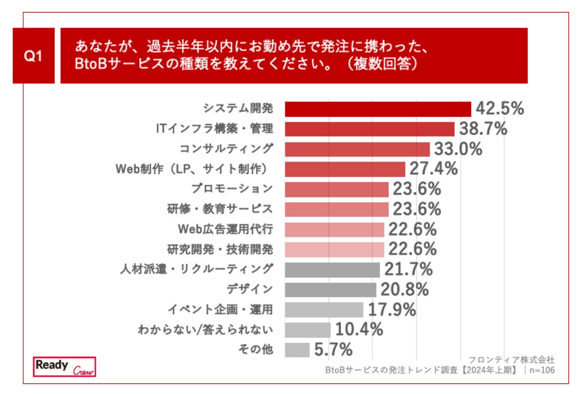 「Q1.あなたが、過去半年以内にお勤め先で発注に携わった、BtoBサービスの種類を教えてください。(複数回答)」(n=106)と質問したところ、「システム開発」が42.5%、「ITインフラ構築・管理」が38.7%、「コンサルティング」が33.0%という回答となりました。