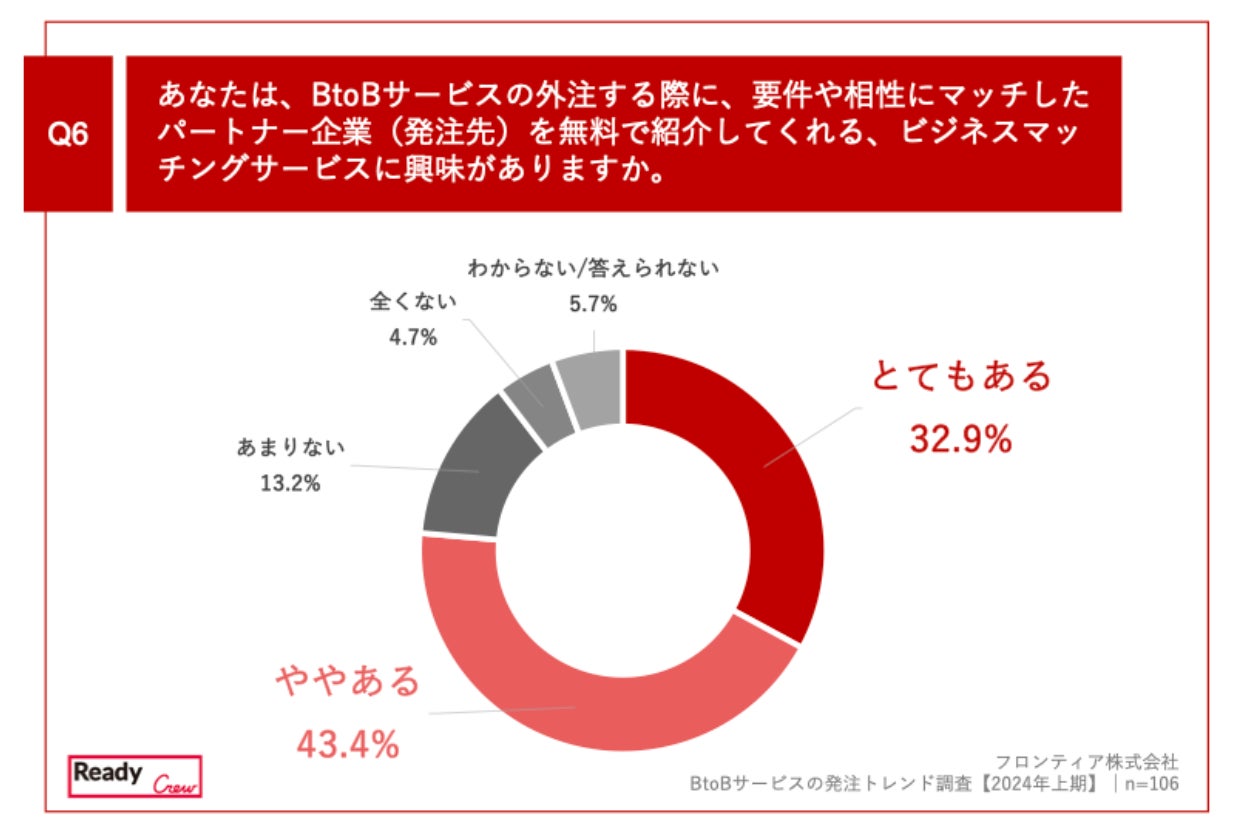 「Q6.あなたは、BtoBサービスの外注する際に、要件や相性にマッチしたパートナー企業(発注先)を無料で紹介してくれる、ビジネスマッチングサービスに興味がありますか。」(n=106)と質問したところ、「ややある」が43.4%、「とてもある」が33.0%という回答となりました。