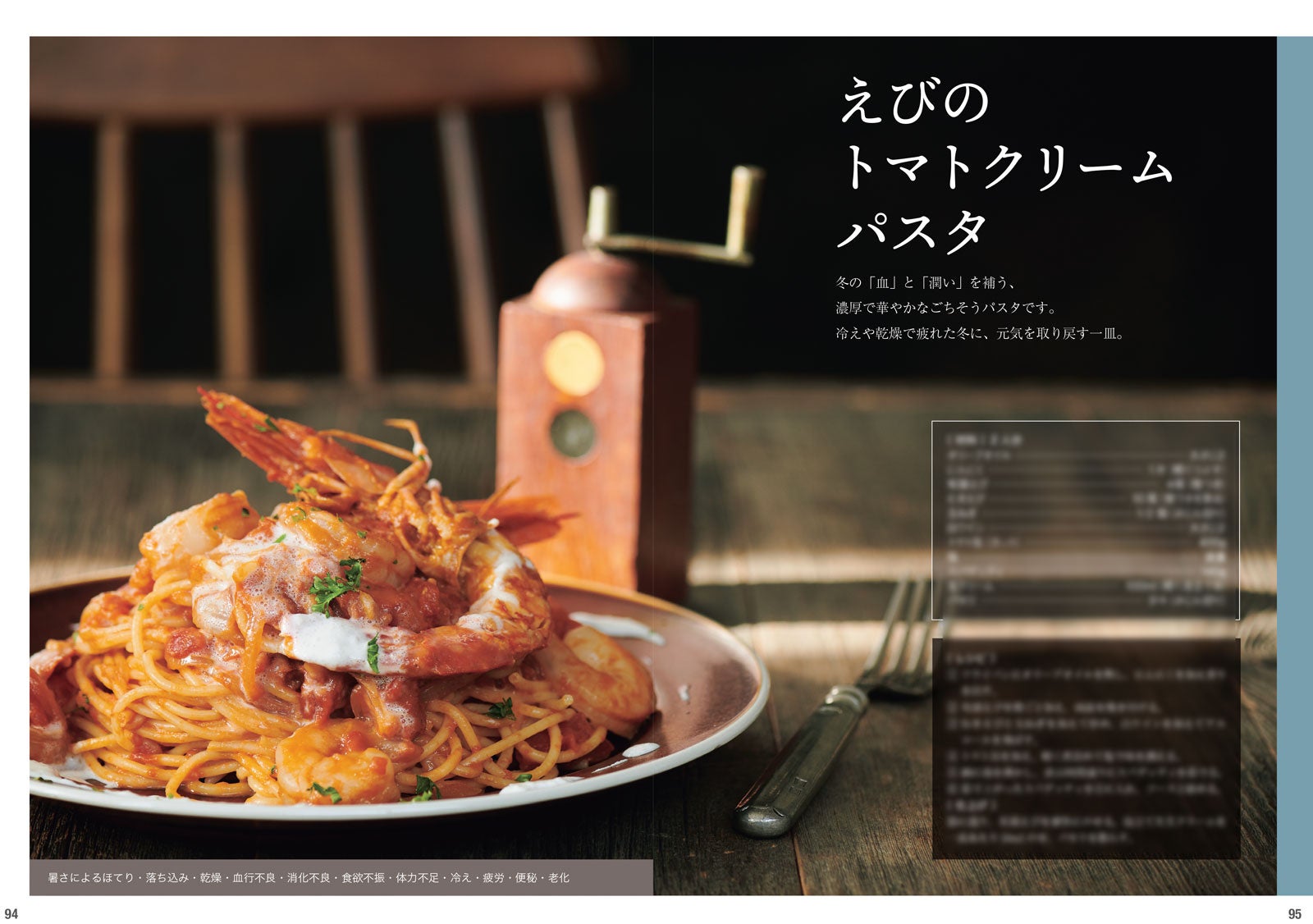 春夏秋冬、旬の食材を活用して体調に合ったレシピを楽しむことができます。それぞれのレシピページには、ストレスや肩こり、むくみなどの症状が書かれており、取り入れたいレシピがすぐにわかります。巻末には便利な「症状別索引」も。