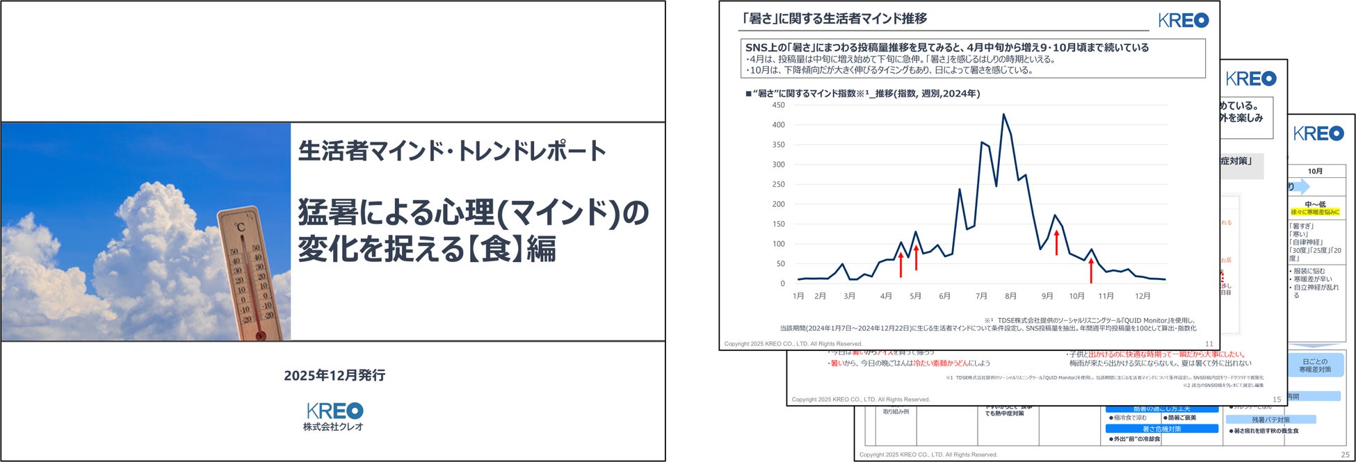 生活者視点をベースにマーケティング支援を行う株式会社クレオ(本社:東京都千代田区、代表取締役社長:横井 司)は、2025年12月10日(水)より独自のSNS投稿分析による「猛暑による心理(マインド)の変化を捉える【食】編」を発売開始しました。