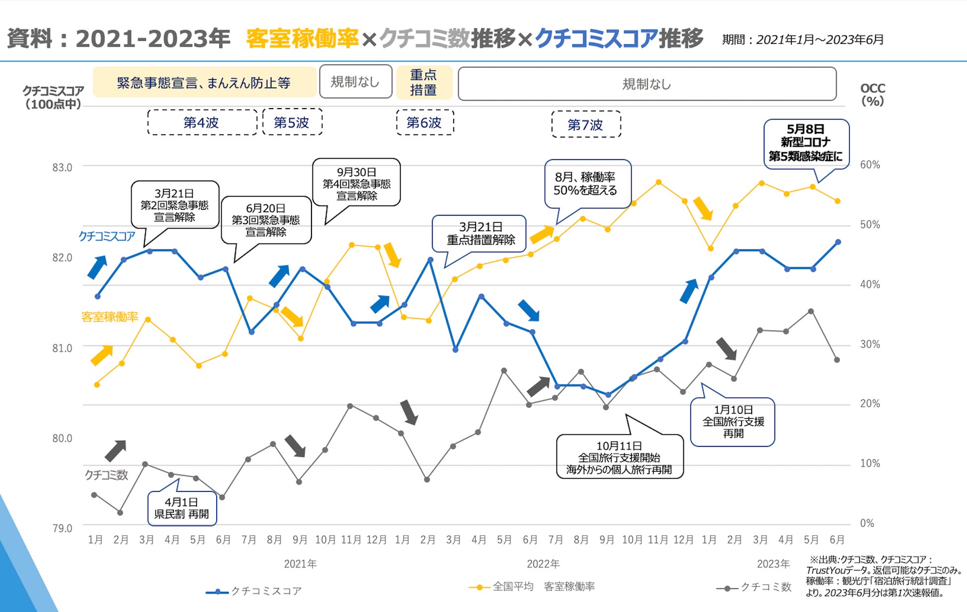 日本国内宿泊施設の客室稼働率、クチコミ数とクチコミスコアの推移(2021年1月〜2023年6月)