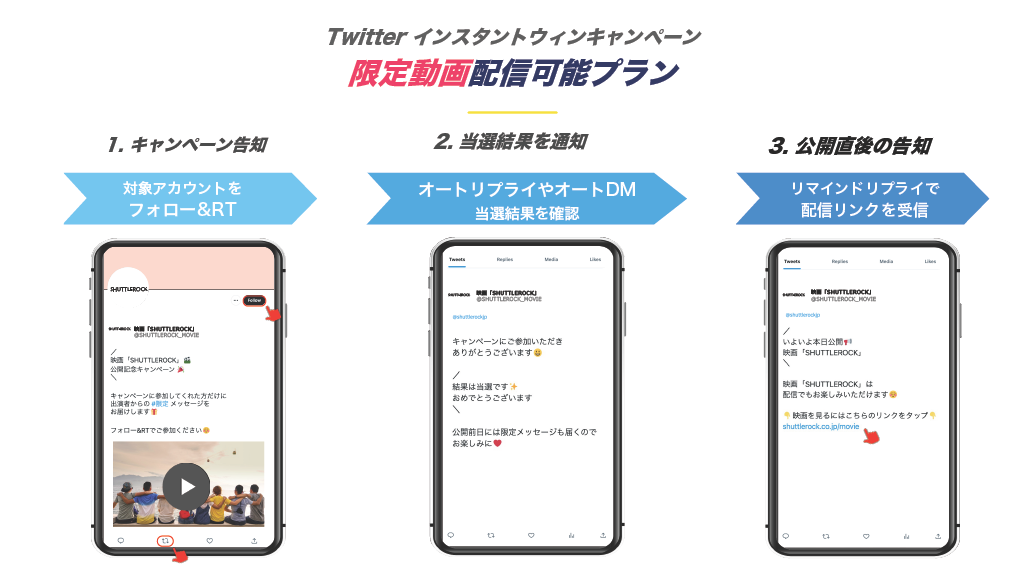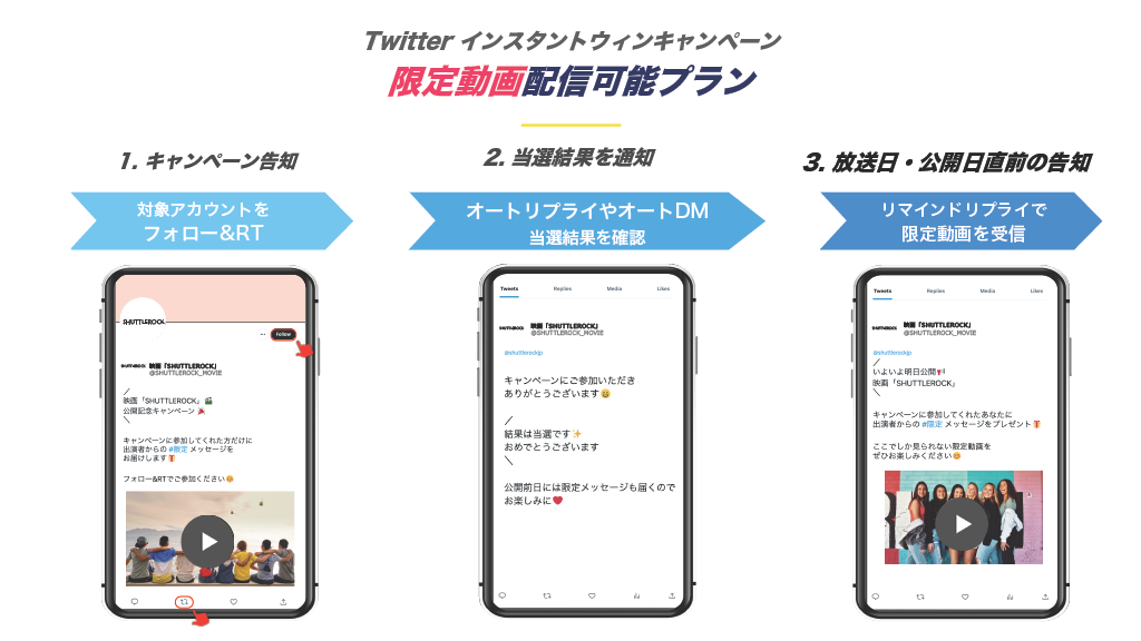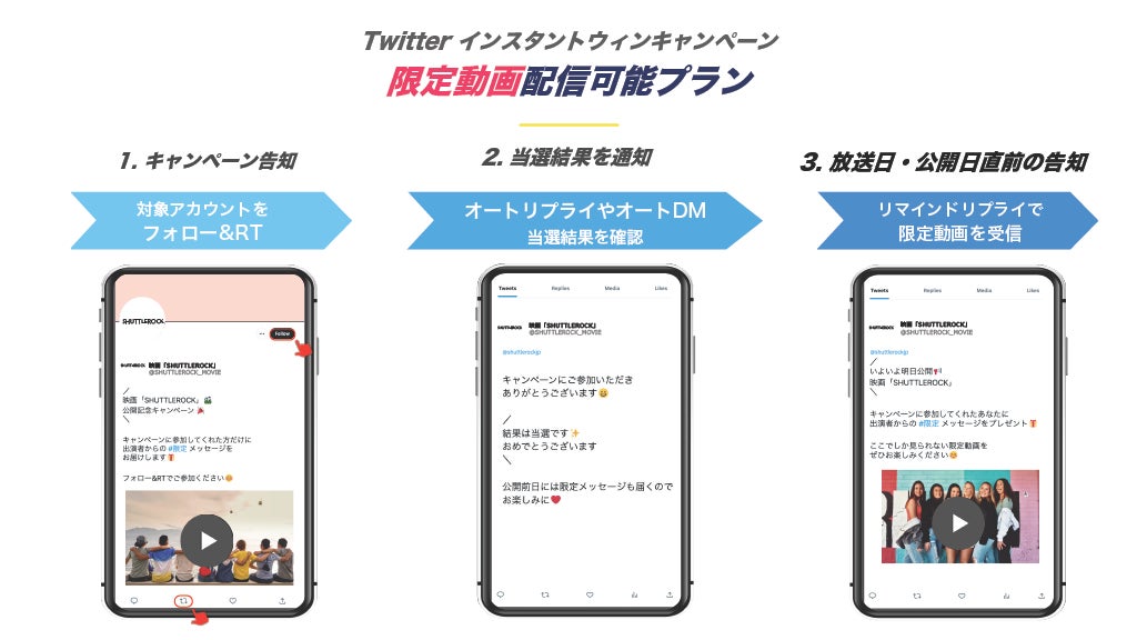 今回リリースした、テレビ・映画業界向けの「限定動画配信可能 Twitterキャンペーンプラン」を利用することで、キャンペーンでの認知拡大だけでなく、キャンペーン参加者にTV番組放送前にリマインドリプライを送信することで番組視聴を促したり、映画公開日にリマインドリプライで限定予告動画などを送信することで、さらにユーザーの興味・関心を高めることができます。