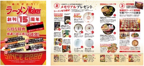 創刊15周年特大号では、感謝のスペシャルコンテンツを多数お届けします。毎年好評の限定麺企画は、15周年メモリアル麺として人気店渾身の新作メニューが登場し、さらにパワーアップ。また、人気店のラーメンが無料や半額で楽しめるお得な特典、「ラーメンWalker」ゆかりのラーメンLOVERSからのお祝いメッセージ、激レア丼などが当たる読者プレゼント企画など、盛りだくさんの内容です。