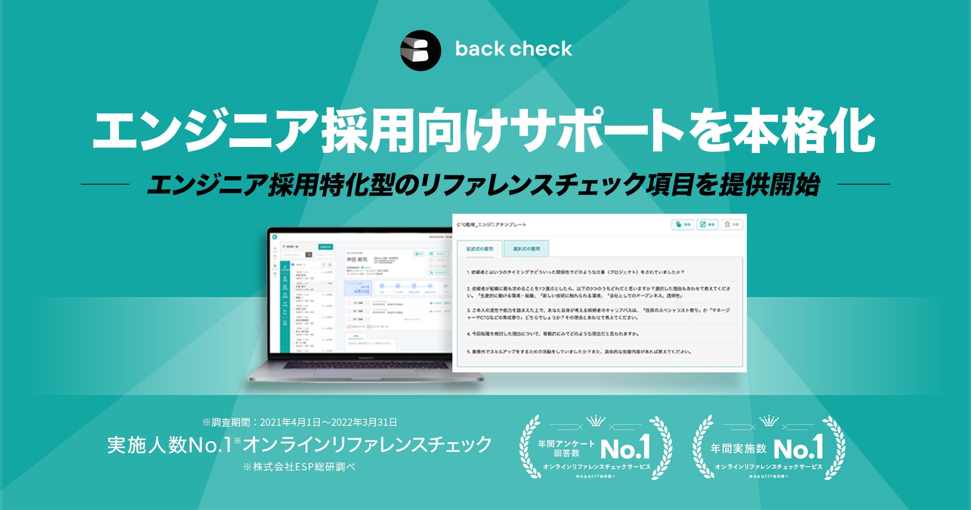 株式会社ROXX(本社:東京都新宿区、代表取締役:中嶋汰朗)が開発・提供する、オンライン完結型リファレンスチェックサービス『back check』は、2022年7月11日、新たにエンジニア採用特化型のリファレンスチェック項目の提供を開始したことをお知らせいたします。これによりエンジニア採用向けのサポートを本格化し、企業の採用活動支援を通した事業成長へのより一層の貢献を目指してまいります。