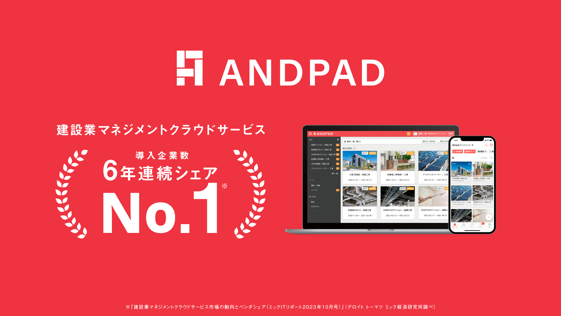 株式会社アンドパッド(本社:東京都千代田区、代表取締役:稲田武夫、以下アンドパッド)が提供するクラウド型建設プロジェクト管理サービス「ANDPAD」は、「建設業マネジメントクラウドサービス市場の動向とベンダシェア」調査※において、導入企業数6年連続シェアNo.1を獲得しました。