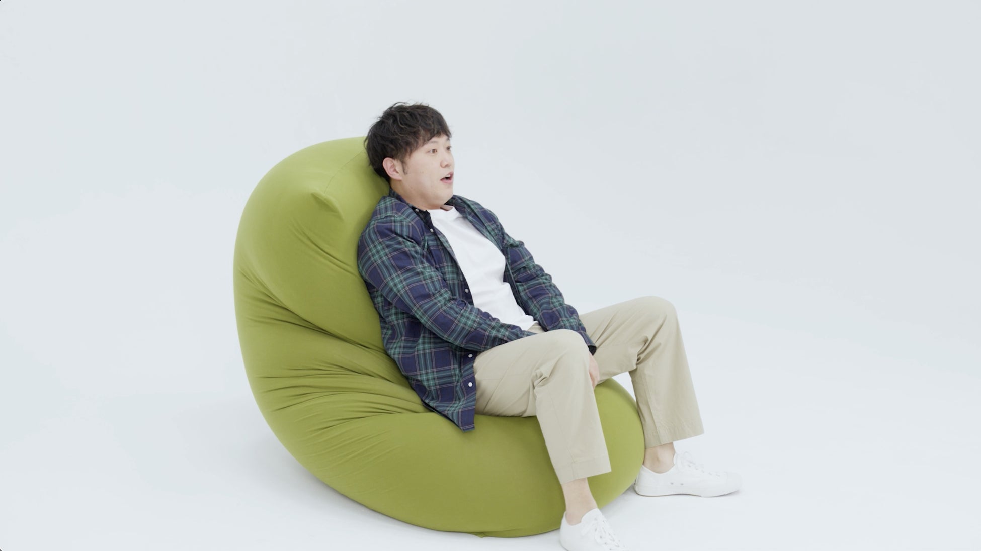 最後に、「でも、この寝そべった体勢のとき初心者の人は下り方が分からないらしいんですけど」と話すと、軽やかにYogiboから駆け降りるサイドスピンを披露。Yogibo歴4年ならではの熟練の使い方を、初心者に向けてコミカルに伝授してくださいました。