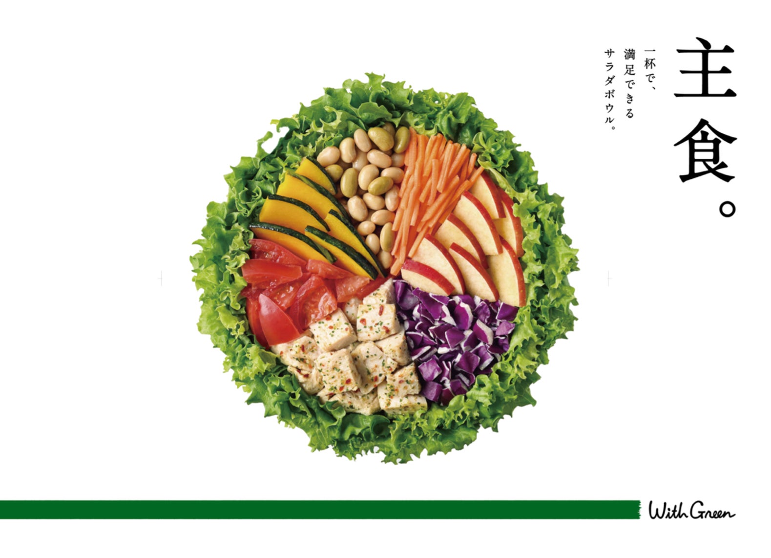 一杯で『主食』となることをコンセプトに、私たちWithGreenはサラダボウルを提供しています。創業以来、台風や天災などの特殊な状況を除いては、国産野菜を使うことを大切にしてきました。日本には四季があり、美味しい旬の野菜があります。2か月ごとに「季節限定サラダ」を作り、日本にある豊かな四季と食材を、サラダボウルを通して楽しんでいただきたいと考えています。