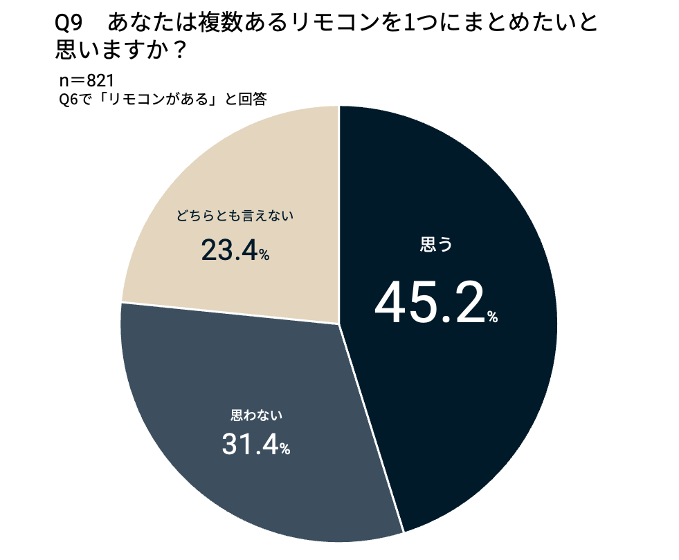 タイパ対策として「家電」の取入れが全世代で最多となった一方、その家電を操作するリモコンが家の中に7個以上あるのは全世代の20%以上、リモコンの数が多いと感じているのは50%以上、家庭内のリモコンを1つに集約したいは45%以上の回答となり、リモコンの存在が時間効率向上にとって重要なのではないかと推測できる。また、プロダクト別ではスマートリモコンとスマートスピーカーなど家電の利便性を向上する機器もそれぞれ20%を超えている。