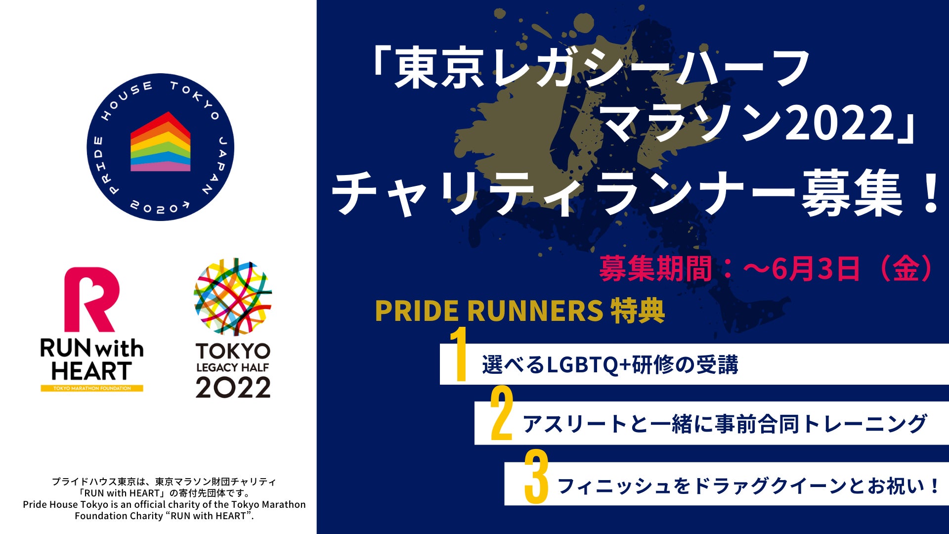 プライドハウス東京は、東京マラソン財団チャリティ「RUN with HEART」の寄付先団体として、10月16日(日)に国立競技場をスタート・フィニッシュとして開催される「東京レガシーハーフマラソン2022」に出場するチャリティランナーを83名募集します。ランナーの皆さんには特典として、選べるLGBTQ+研修やアスリートとの事前合同トレーニングにもご参加いただけます。
