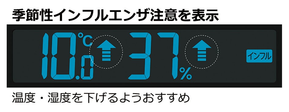 高精度温度・湿度センサーが室内環境を感知し、「季節性インフルエンザ」、「カビ・ダニ」、「熱中症」、「食中毒」でそれぞれ表示色を切り替えて注意を喚起します。